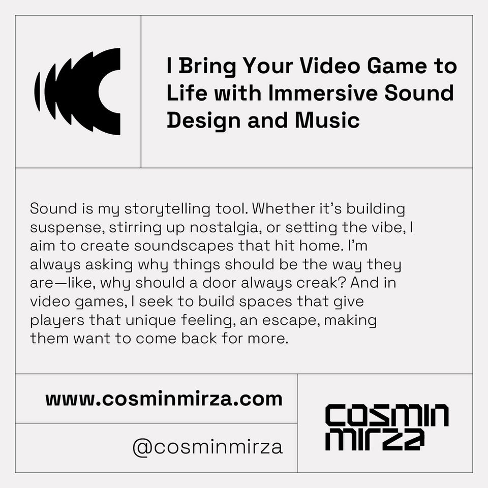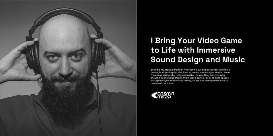The main focus was the website because I wanted to deliver him a space where he can be creative and free of any other social network limitations. I created an online real estate where you can visit and get to know him. Cosmin is one deeply involved with the community of game designers. Hosting events, gathering people and building a network is what he does in the free time. So we decided to build a blog inside the website where he can write the articles and thoughts in order to inform and educate about sound and music in video games. Later down the road, a new page of classes and courses is to be published and quite a few more products he's been working for the past years. His mantra is "I'm always listening."